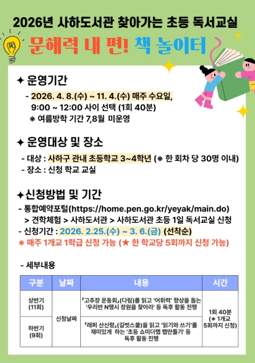 [파이낸셜경제=박영진 기자] 부산시교육청 사하도서관은 4월부터 11월까지(7, 8월 제외) 사하구 관내 초등학교에서 3~4학년 학생을 대상으로 2026년 찾아가는 초등 독서교실 ‘문해력 내 편! 책 놀이터’를 운영한다.