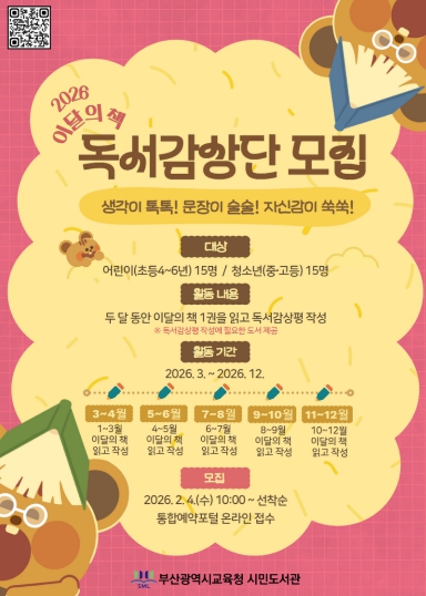 [파이낸셜경제=박영진 기자] 부산광역시립시민도서관(관장 이은경)은 오는 3월부터 12월까지 초·중·고 학생 30명을 대상으로 ‘이달의 책 독서감상단’을 운영한다.