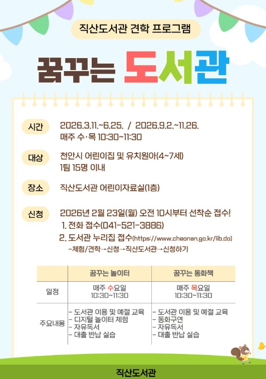 꿈꾸는 도서관은 어린이집과 유치원을 대상으로 운영되며, 견학 신청은 오는 23일 오전 10시부터 전화 또는 천안시도서관 누리집에서 선착순으로 진행된다.