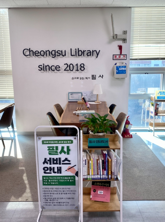 청수도서관은 3층 종합자료실 큰글자도서 코너에 전용 필사석을 마련하고 필사 요령과 저작권법 등에 대해 안내하고 있다. 리더스원 출판사의 지원으로 필사용 공책도 제공할 예정이다.