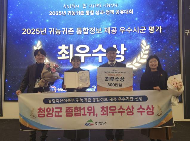 [파이낸셜경제=김영란 기자] 청양군은 농림축산식품부가 주관한 2025년 귀농귀촌 통합정보 제공 우수 시·군 평가에서 전국 1위를 차지하며 최우수상을 수상했다고 18일 밝혔다.