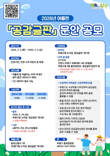 [파이낸셜경제=김기보 기자] 부평구가 3월 3일부터 4월 3일까지 한 달간 ‘2026년 여름편 공감글판’ 문안을 공모한다.