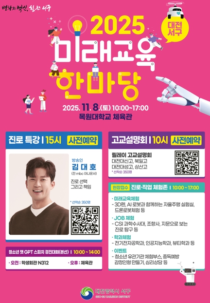 [파이낸셜경제=김영란 기자] 대전 서는 11월 8일 목원대학교 체육관에서 초중고 학생·청소년과 학부모를 대상으로 ‘서구 미래교육한마당’ 행사를 개최한다.
