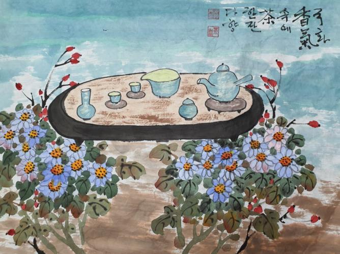 대표 출품작인 ‘차 한잔’은 국화꽃과 함께하는 찻 자리를 수묵담채로 풀어내었고 ‘차향에 스미다’는 매화와 차를 준비하는 인물을 대담한 구도로 그려내었다.