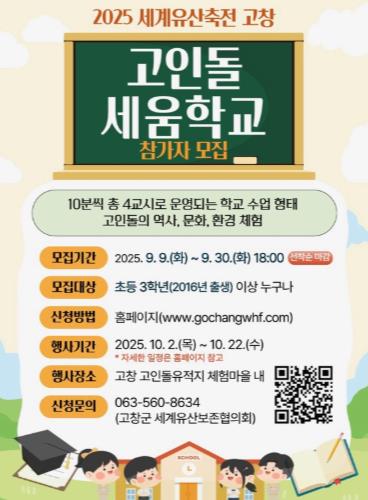 프로그램 사전예약은 ’2025 세계유산축전 고창 고인돌·갯벌‘ 공식 홈페이지에서 신청할 수 있으며, 기타 자세한 안내는 고창군 세계유산보존협의회로 문의하면 된다.