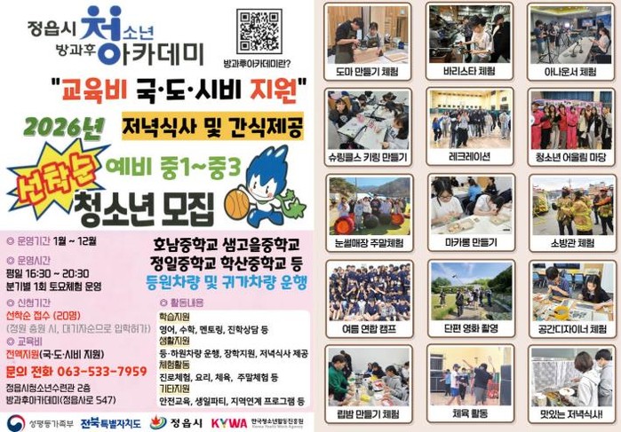 [파이낸셜경제=김예빈 기자] 정읍시와 성평등가족부가 지원하는 정읍시 청소년방과후아카데미가 지역 청소년들의 건강한 성장과 역량 개발을 돕기 위해 2026년도 신입생 모집에 나섰다.