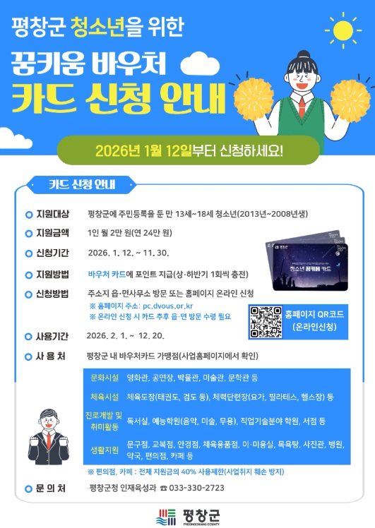 먼저, 청소년 꿈키움 바우처 카드 지원사업은 평창군에 주민등록을 둔 만 13세부터 18세까지의 청소년(2008년~2013년생)을 대상으로, 1인당 월 2만 원(연 24만 원)의 바우처 포인트를 지원하는 사업이다.