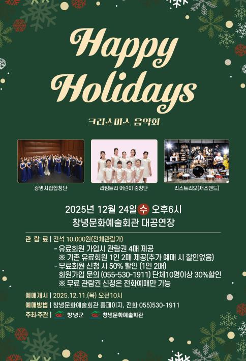 [파이낸셜경제=김예빈 기자] 창녕군은 오는 24일 오후 6시 창녕문화예술회관 대공연장에서 온 가족이 함께 즐길 수 있는 기획공연 ‘크리스마스 음악회’를 개최한다고 밝혔다.