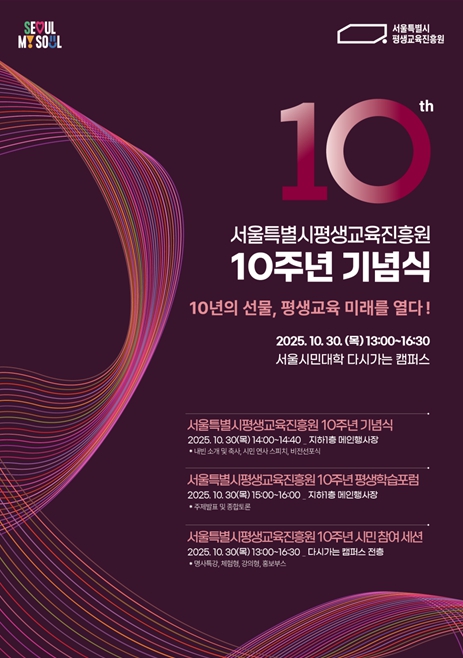 [파이낸셜경제=김예빈 기자] 서울시평생교육진흥원이 설립 10주년을 맞아 오는 10월 30일 서울시민대학 다시가는 캠퍼스에서 '서울시평생교육진흥원 10주년 기념식'을 개최한다. 이번 행사는 지난 10년의 성과를 되짚고 미래 비전을 제시하는 자리를 넘어, 시민이 직접 참여하고 즐기는 다채로운 축제의 장으로 마련된다.