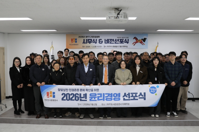 [파이낸셜경제=김기보 기자] 파주도시관광공사는 지난 1월 2일 본청 대회의실에서 ‘2026년 윤리경영 선포식’을 개최하여 청렴과 인권을 기반으로 한 윤리경영 실천 의지를 대내외에 공식 선언했다.