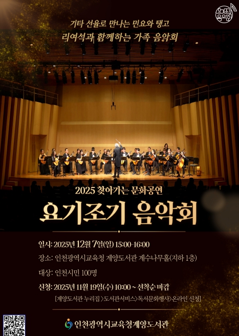 [파이낸셜경제=김기보 기자] 인천광역시교육청계양도서관은 연말을 맞아 12월 7일 오후 3시 계양도서관 계수나무홀에서 찾아가는 문화공연 ‘요기조기 음악회’를 개최한다고 밝혔다.