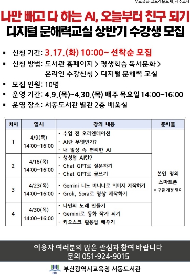 [파이낸셜경제=박영진 기자] 부산광역시교육청서동도서관(관장 이진옥)은 오는 4월 9일부터 30일까지 매주 목요일 서동도서관 별관에서 지역 주민 10명을 대상으로 상반기 디지털 문해력 교실 ‘나만 빼고 다 하는 AI, 오늘부터 친구되기’를 운영한다.