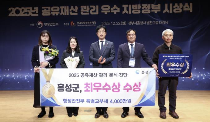 [파이낸셜경제=김영란 기자] 홍성군은 행정안전부가 실시한 ‘2025년 공유재산 관리·분석 진단 평가’에서 최우수 자치단체에 선정되며 특별교부세 4천만원의 인센티브를 지원받게 됐다.
