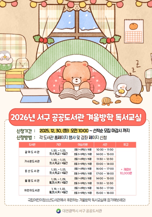 [파이낸셜경제=김영란 기자] 대전 서구는 겨울방학을 맞아 관내 초등학교 1~5학년 어린이를 대상으로 5개 공공도서관에서 ‘겨울방학 독서 교실’을 운영한다고 23일 전했다.