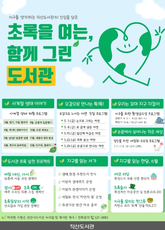 [파이낸셜경제=김영란 기자] 천안시 직산도서관이 올해 생태와 환경을 주제로 ‘초록을 여는, 함께 GREEN 도서관’을 운영한다고 4일 밝혔다.