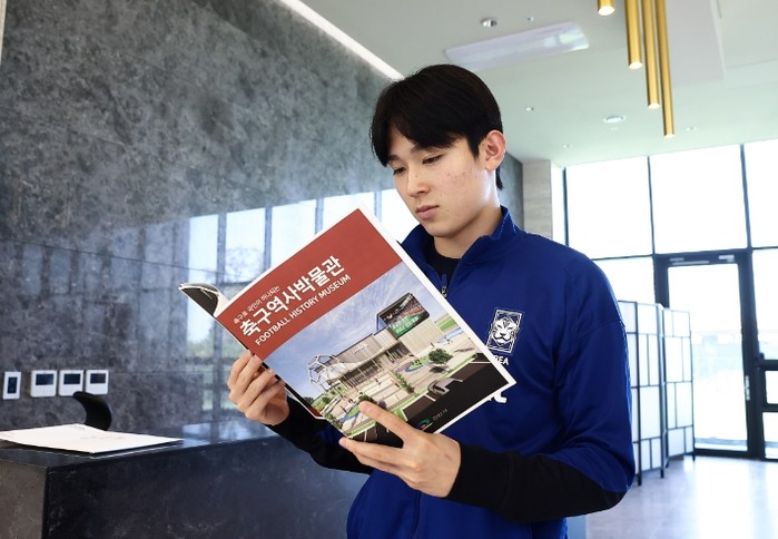 | ▲ 천안 대한민국 축구종합센터에 소집된 국가대표 양민혁 선수가 축구역사박물관 홍보 자료를 읽고 있다. |