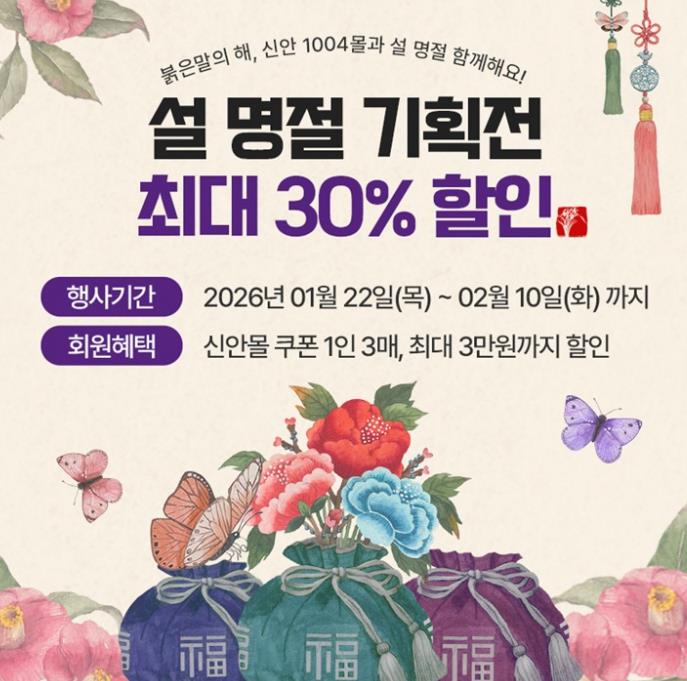 [파이낸셜경제=김예빈 기자] 신안군은 다가오는 설 명절을 맞아 지역 농어가와 소상공인 판로 확대를 위해 온라인 쇼핑몰 ‘신안1004몰)’에서 1월 22일부터 2월 10일까지 설 명절 특별 기획전을 진행한다.