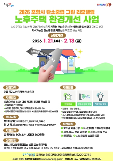 [파이낸셜경제=김지훈 기자] 포항시는 노후주택의 주거환경 개선과 에너지 비용 절감을 위해 2026년도 그린리모델링 지원사업을 시행한다.