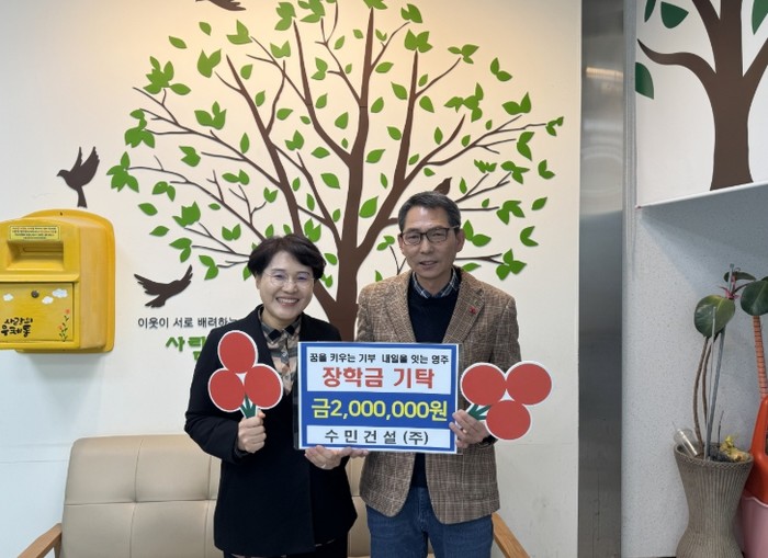 [파이낸셜경제=김지훈 기자] 영주시 수민건설 주식회사(대표 김효식)는 지난 20일 가흥1동 행정복지센터(동장 안순기)를 방문해 새로운 세상을 향해 첫발을 내딛는 예비 대학생을 위한 ‘응원 장학금’ 200만 원을 기탁했다.
