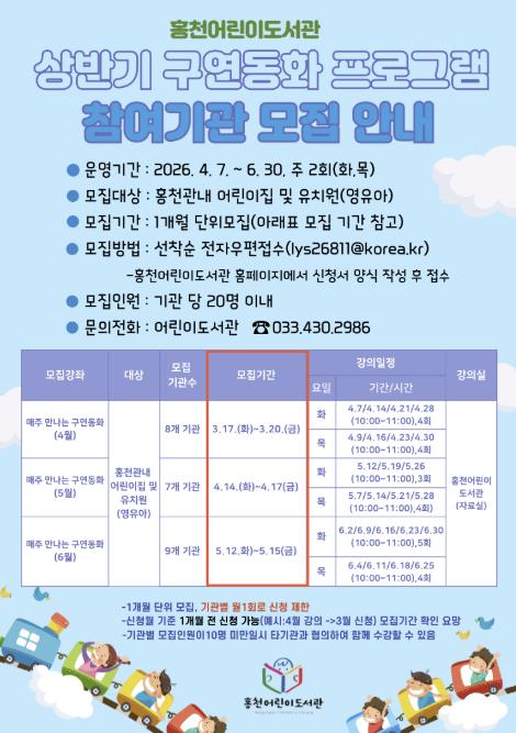 [파이낸셜경제=조성환 기자] 홍천군은 영유아에게 그림책을 통해 정서적 안정 및 사회성 향상에 도움을 주며 책과 도서관을 가까이할 기회 제공을 위한 2026년 상반기 홍천 어린이도서관 '매주 만나는 구연동화' 프로그램 참여기관을 모집한다.