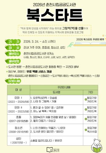 [파이낸셜경제=조성환 기자] 춘천시립도서관이 오는 24일부터 연령별 북스타트 꾸러미를 배부한다.