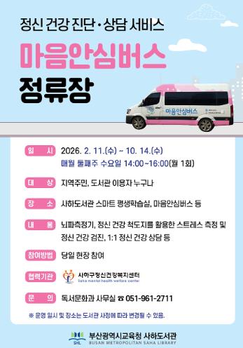 [파이낸셜경제=박영진 기자] 부산광역시립사하도서관은 오는 2월부터 10월까지 매월 둘째 주 수요일마다 도서관 스마트 평생학습실과 마을안심버스에서 지역주민을 대상으로 ‘마을안심버스 정류장’을 운영한다.