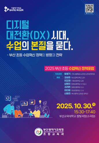 [파이낸셜경제=박영진 기자] 부산광역시교육청은 오는 30일 오후 부산교육대학교 참빛극장에서 초등 교원과 교육전문직원 등 200여 명을 대상으로 ‘디지털 대전환(DX)* 시대, 수업의 본질을 묻다’를 슬로건으로 ‘2025 부산 초등 수업혁신 정책포럼’을 개최한다고 밝혔다.