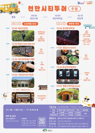 이용 희망자는 천안시 문화관광 누리집에서 직접 예약하거나, 천안역·천안종합터미널 관광안내소에 유선으로 신청하면 된다.