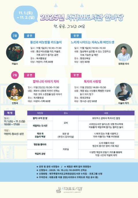 [파이낸셜경제=김영란 기자] 제주도교육청 서귀포도서관은 11월 1일과 2일 양일간 지역 주민이 함께 즐기는 독서문화 축제 ‘2025년 서귀포도서관 한마당’을 개최한다.