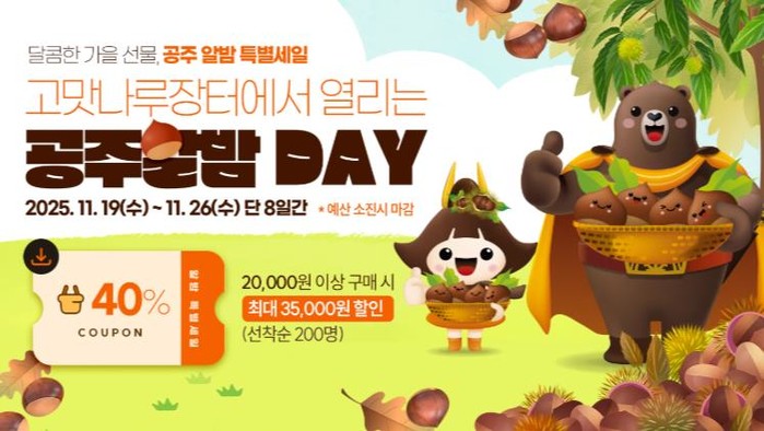 이번 ‘공주알밤 DAY’ 기획전에서는 공주시가 준비한 공주밤 할인권(40%)이 제공되며, 최대 3만 5천 원까지 값을 낮춰 소비자들이 공주밤을 더욱 알맞은 가격으로 구매할 수 있다.