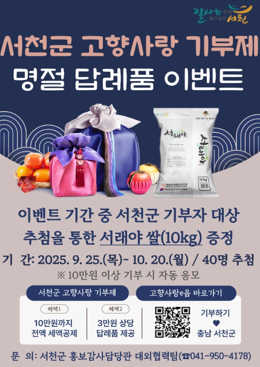 이충희 홍보감사담당관은 “추석 명절 고향을 생각하는 마음으로 고향사랑기부에 동참해 주시길 바란다”며 “세액공제 혜택은 물론 서천의 답례품과 함께 질 좋은 서래야 쌀도 받아보시길 바란다”고 밝혔다.