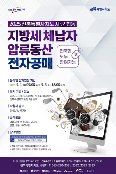 [파이낸셜경제=김예빈 기자] 전북특별자치도는 전국 최초로 한국자산관리공사(온비드) 이용기관 페이지를 활용한 시‧군 합동 압류물품 온라인 전자공매를 실시한 결과, 총 288건이 전량 낙찰되어 2억7천7백만 원의 체납액을 징수했다고 27일 밝혔다.