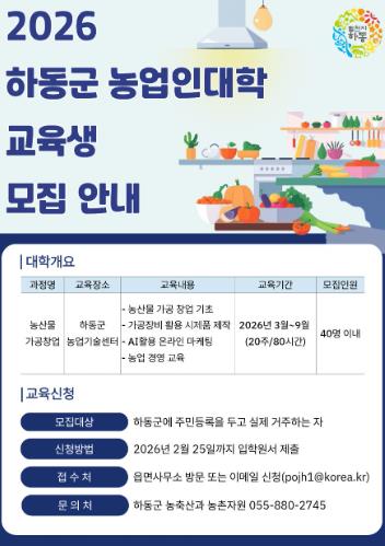 [파이낸셜경제=김예빈 기자] 하동군은 농산물 가공 및 창업을 희망하는 군민을 대상으로 전문 인력을 육성하기 위해 ‘2026년 하동군농업인대학’ 교육생을 오는 2월 25일까지 모집한다고 밝혔다.