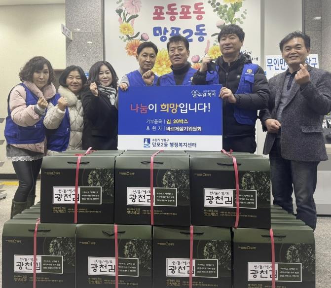 [파이낸셜경제=김기보 기자] 영통구 망포2동 행정복지센터는 지난 6일 망포2동 바르게살기위원회가 관내 저소득 가정을 지원하기 위해 김 20박스를 기탁했다고 밝혔다.