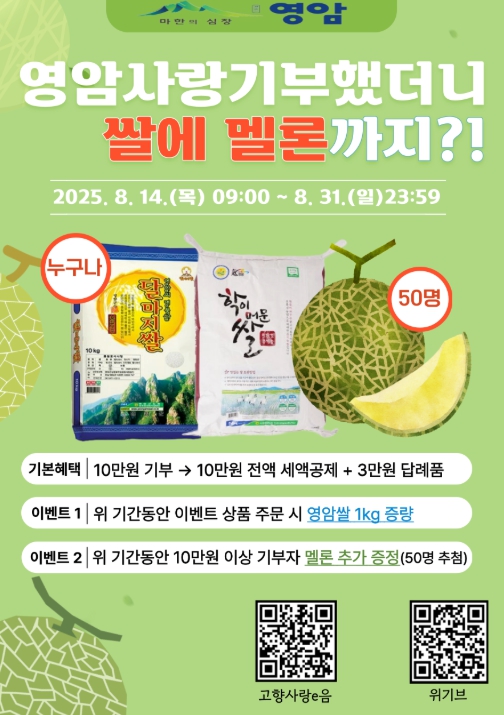 [파이낸셜경제=김예빈 기자] 영암군이 14~31일 고향사랑기부 특별 이벤트 ‘영암사랑기부했더니 쌀에, 멜론까지?!’를 진행한다.