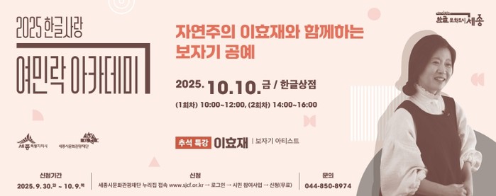 [파이낸셜경제=김영란 기자] 세종시문화관광재단(대표이사 박영국)은 ‘2025 한글사랑 여민락 아카데미 추석 특별강좌’를 오는 10월 10일 진행한다.