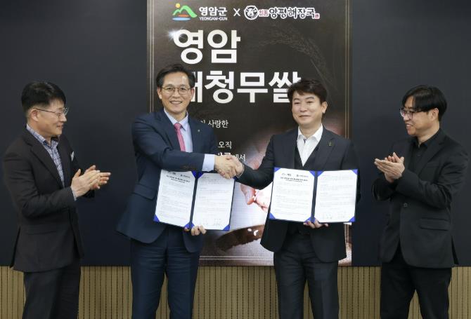 [파이낸셜경제=김예빈 기자] 영암군이 11일 군청에서 ‘일품양평해장국’ 외식 프랜차이즈 ㈜우분트월드와 영암 농특산물 판매 활성화 업무협약을 체결했다.