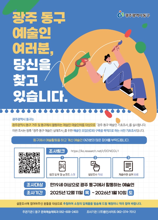 지난 11일 시작한 이번 조사는 향후 추진할 ‘광주 동구 예술인 실태조사’를 위한 예술인 모집단을 구축하기 위한 사전 기초조사로, 동구 예술인 전체를 대상으로 기본 현황을 파악하는 데 목적이 있다.