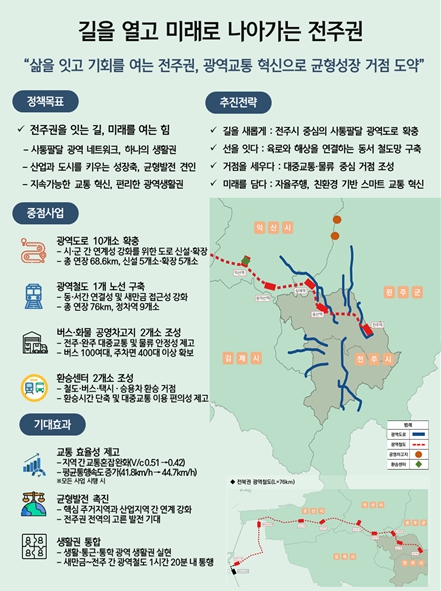 주요 사업은 △전주 중심의 방사형 광역도로 10개 노선(신설 5개, 확장 5개) △전주~새만금을 잇는 동서축 광역철도 1개 노선(정차역 9곳) △버스‧화물 공영차고지 2곳 △환승센터 2곳 건설 등으로 전주권 광역교통 인프라 전반의 혁신을 목표로 하고 있다.