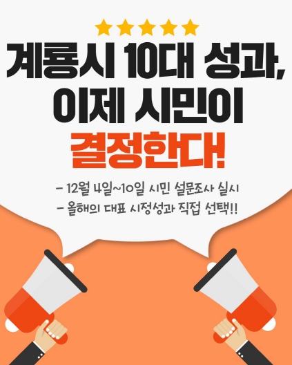 [파이낸셜경제=김영란 기자] 계룡시는 12월 4일부터 10일까지'2025 계룡시를 빛낸 10대 성과'시민 설문조사를 실시한다고 밝혔다.