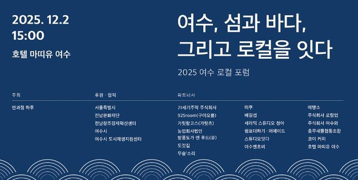 [파이낸셜경제=김예빈 기자] 여수시는 ‘연과점 하루’가 오는 12월 2일 오후 3시 마띠유호텔에서 ‘여수, 섬과 바다, 그리고 로컬을 잇다 - 2025 여수 로컬 포럼’을 개최한다고 밝혔다.