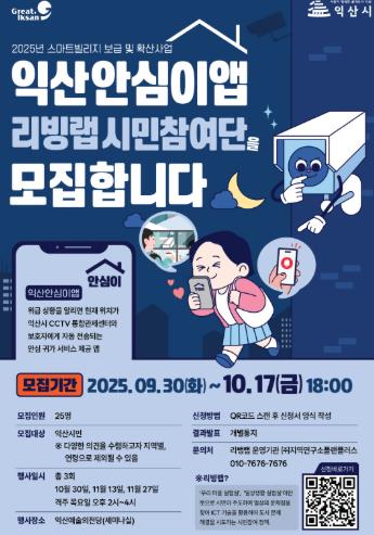 시민참가자 모집 기간은 오는 17일까지이며, 익산시민 누구나 익산시 누리집에 게시된 큐알(QR)코드를 통해 신청할 수 있다.