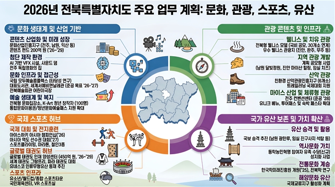 [파이낸셜경제=김예빈 기자] 전북특별자치도가 2026년 문화·관광·체육 정책을 재정비한다. 창작 기반과 산업, 지역 경제로 이어지는 구조를 구축하고, 정책 간 경계를 낮춰 수요와 현장 중심으로 재편한다는 구상이다.