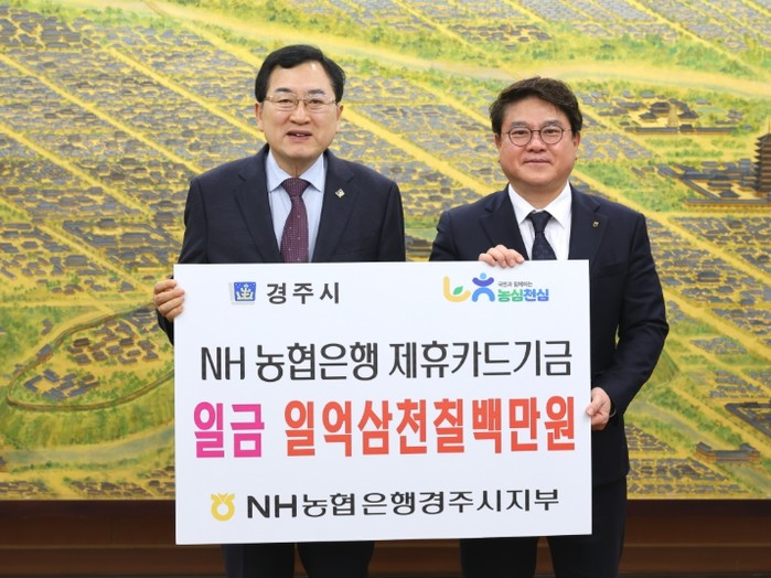 [파이낸셜경제=김지훈 기자] 경주시는 25일 시청 대외협력실에서 NH농협은행 경주시지부(지부장 황대화)로부터 지난해 제휴카드 사용에 따른 적립기금 1억 3,715만 5,240원을 전달받았다.
