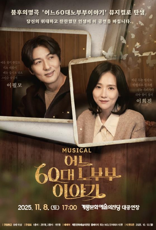 [파이낸셜경제=김영란 기자] 계룡시는 오는 11월 8일 오후 5시, 계룡문화예술의전당 대공연장에서 뮤지컬 ‘어느 60대 노부부 이야기’를 공연한다.