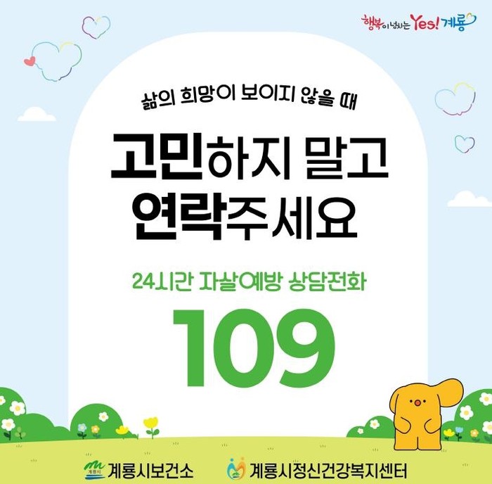 언제든지 정신적 어려움과 위기 상황에 놓인 주민들은24시간 자살 예방 상담전화(☎109)로 연락하면 도움을 받을 수 있다.