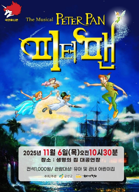 [파이낸셜경제=김영란 기자] 금산군은 지역 내 아이들에게 수준 높은 문화예술을 전하기 위해 어린이 뮤지컬 ‘플라잉 피터팬’을 11월 6일 오전 10시 30분 금산다락원 생명의 집 대공연장에서 공개한다.