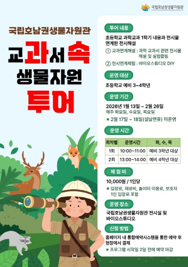 [파이낸셜경제=김예빈 기자] 기후에너지환경부 산하 국립호남권생물자원관은 겨울방학을 맞이하여 예비 초등학교 3학년부터 4학년을 대상으로 교과서에 나오는 생물을 전시관에서 직접 만나보는 프로그램인 ‘교과서 속 생물자원 투어’를 1월 13일부터 2월 26일까지 운영한다고 밝혔다.