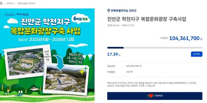 [파이낸셜경제=김예빈 기자] 진안군이 고향사랑기부제 지정기부사업으로 지난 6월부터 추진 중인 “학천지구 복합문화광장 구축사업”이 모금 시작 6개월 만에 누적 모금액 1억 원을 달성했다.