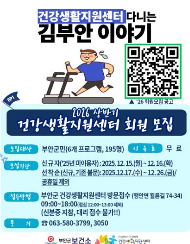 오는 15~16일은 신규 이용자(2025년 미이용자) 우선 모집, 17~26일은 전체 부안군 성인 대상 선착순 모집으로 진행되며 접수는 건강생활지원센터 방문 접수만 가능하다.